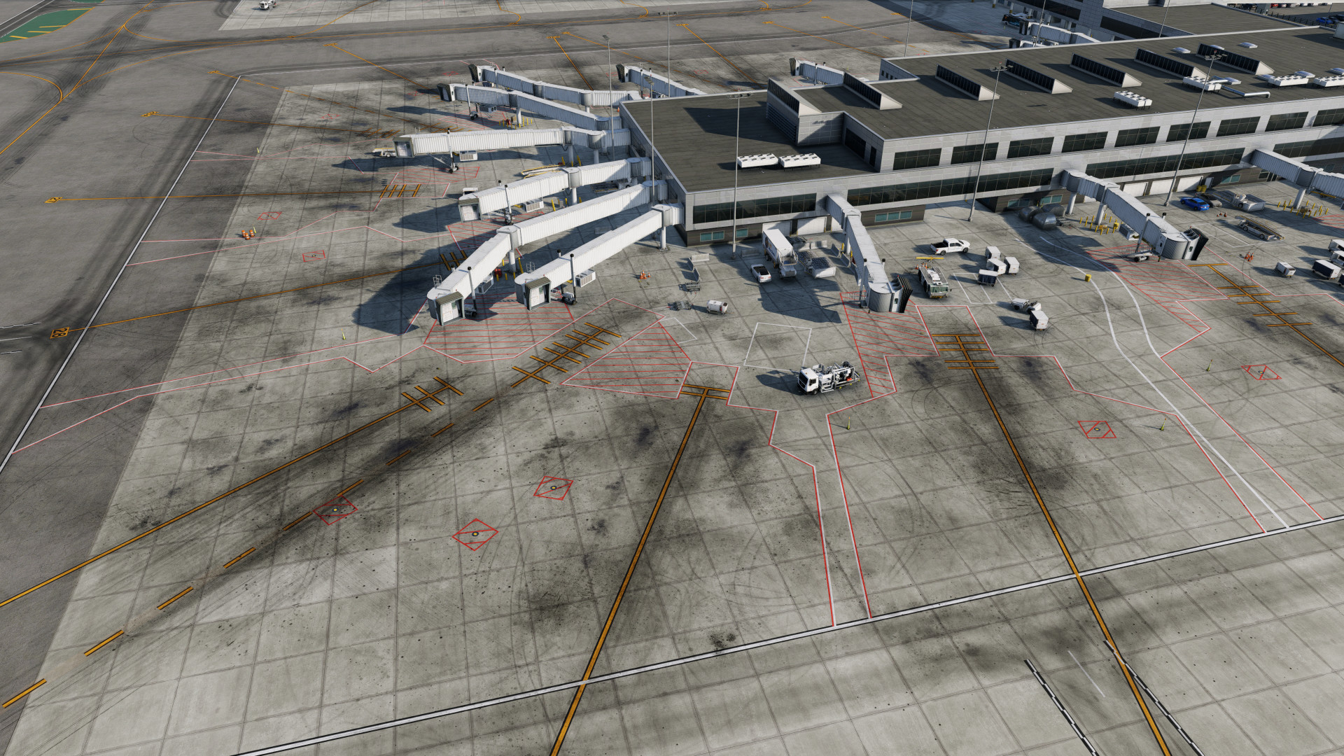 Using our in-house software, procedural overlays are generated based on the default scenery. Using regional and airport parameters, grunge, rust, and skids are added to give airports a authentic and used feel. Additional service vehicles, and clutter make airports feel lived in and busy. New models for static cars, most service vehicles, many hangars, and numerous clutter objects such as trash cans, cones, and fuel stations make every airport feel like a premium experience!